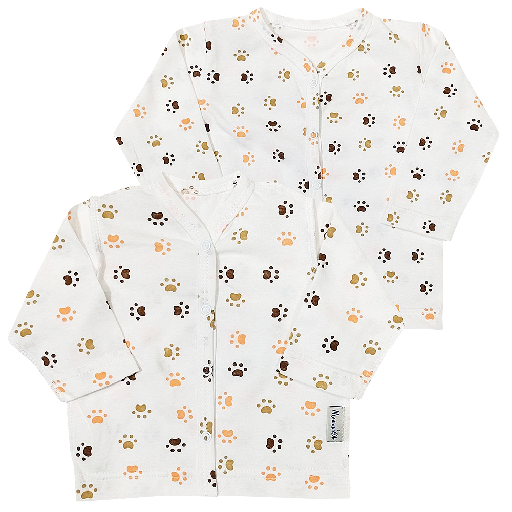 Футболка ясельная, изготовлена из мягкого, приятного для кожи кулирного полотна с невероятно нежной петельчатой изнанкой (100% хлопок). Декорирована кошачьим принтом «Следы лапок». Модель швами вовнутрь, прямого силуэта с втачным коротким рукавом. Вырез горловины круглый, обработан бейкой из эластичного полотна в тон. На плечике застежка на 2 пробивные кнопки, кроме размера 98. Низ изделия и рукавов подвернут и прострочен двойной строчкой.
