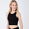 Топ женский черного цвета, свободного кроя из эластичного х/б трикотажа в мелкий рубчик (рибана). Низ топа с подгибом, горловина и проймы обработаны широкой бейкой из материала основного изделия. В топе нет конструктивных швов или деталей помогающих поддерживать форму груди.