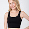 Топ женский черного цвета, свободного кроя, из эластичного х/б трикотажа, в мелкий рубчик (рибана). Низ топа с подгибом, горловина и проймы обработаны широкой бейкой из материала основного изделия. В топе нет конструктивных швов или деталей помогающих поддерживать форму груди.