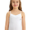Майка для девочки на тонких бретелях. Выполнена из эластичного х/б трикотажа кулирное полотно. Модель в белом цвете полуприлегающего силуэта. Декорирована аппликацией из страз и атласным бантом. Бретели и отделка выреза из эластичного трикотажа.