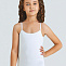 Майка для девочки, на тонких бретелях. Выполнена из эластичного х/б трикотажа кулирное полотно. Модель в белом цвете полуприталенного силуэта. Полукруглый вырез декорирован бантиком из тесьмы. Бретели, отделка выреза из тонкой резинки с фестончатым краем. Низ изделия обработан швом вподгибку двойной строчкой.