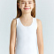 Майка для девочки на широких бретелях. Выполнена из эластичного х/б трикотажа кулирное полотно. Модель в белом цвете полуприталенного силуэта. Вырез горловины круглый, отделан тонкой резинкой с фестончатым краем, декорирован атласным бантиком. Бретели, вырез и проймы отделаны эластичным трикотажным кантом. Низ изделия обработан швом вподгибку двойной строчкой.