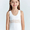 Майка для девочки, белого цвета, из эластичного х/б трикотажа, со вставкой из эластичного кружева на груди. Полуприталенный силуэт. Широкие бретели. Полукруглый вырез украшен атласным бантиком. Вырез, бретели отделаны тонкой резинкой с фистончатым краем.