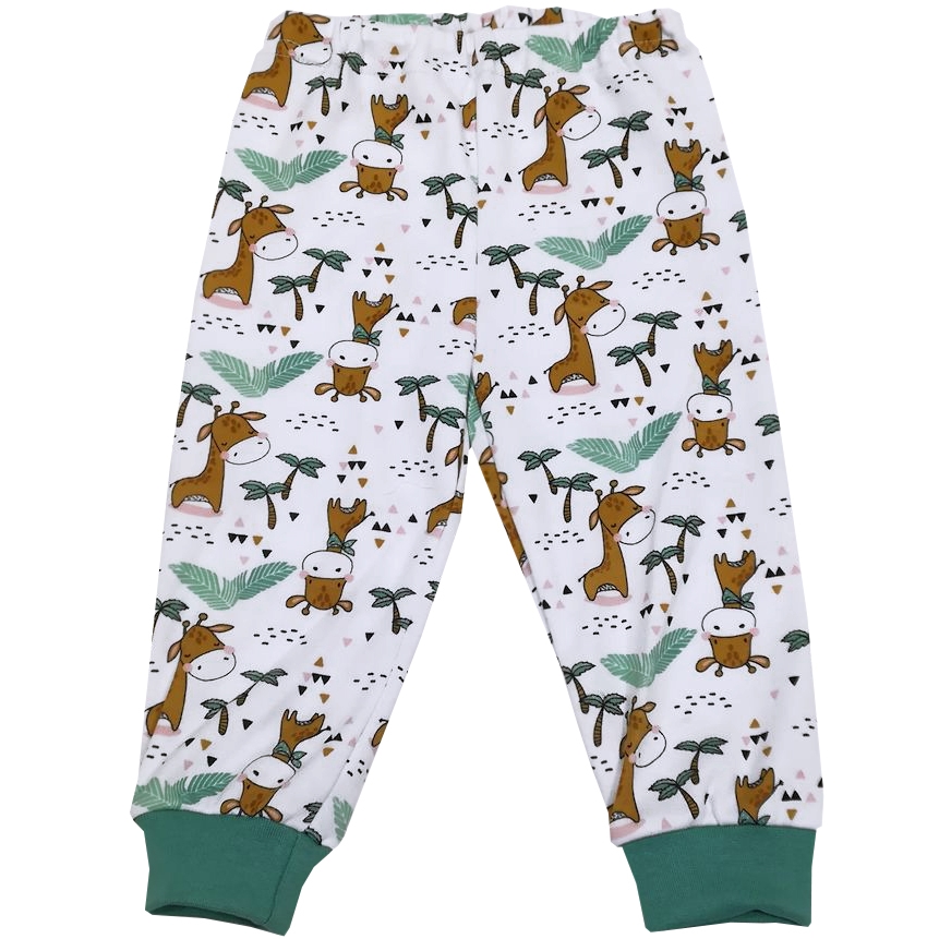 Брючки ясельные, из х/б трикотажа с красочными рисунками "жирафики". В поясе на закрытой резинке, снизу на манжетах из евро-резинки.