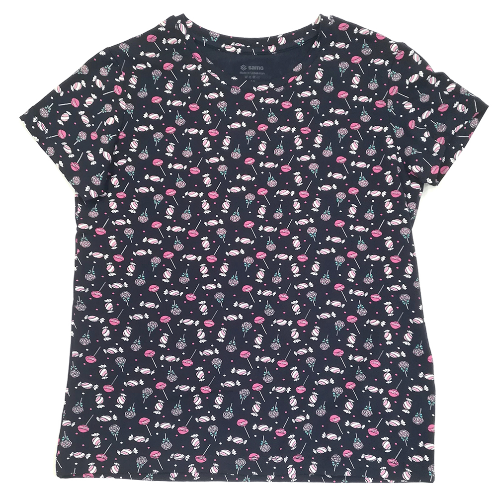 Футболка женская, изготовлена из эластичного х/б трикотажа (кулирное полотно). Cвободного кроя. Украшена принтом "Леденцы". Горловина круглая, обработана воротником из кулирки, в цвет изделия. Горловина спинки внутри обработана настрочной планкой из кулирки. Рукав короткий, втачной. Низ изделия и рукавов обработан швом вподгибку двойной строчкой.