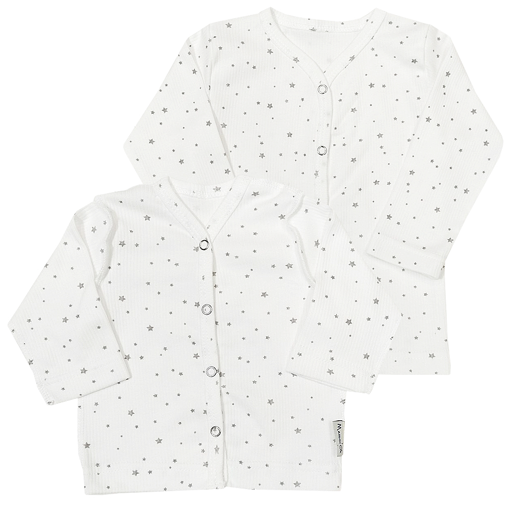 Кофточка прямого кроя для новорожденных малышей. Изготовлена из мягкой и дышащей ткани - интерлок, фактурной вязкой в лапшу с нанесением рисунка "Звёздочки". Горловина и планка обработаны трикотажным кантом из эластичного полотна в тон. Застёжка кофточки выполнена в виде удобных кнопок по центру, по всей длине. Низ рукавов и изделия подвернут и прострочен двойной строчкой. С лицевой стороны в боковом шве вшивной элемент. У размеров 56, 62, 68 швы наружу.