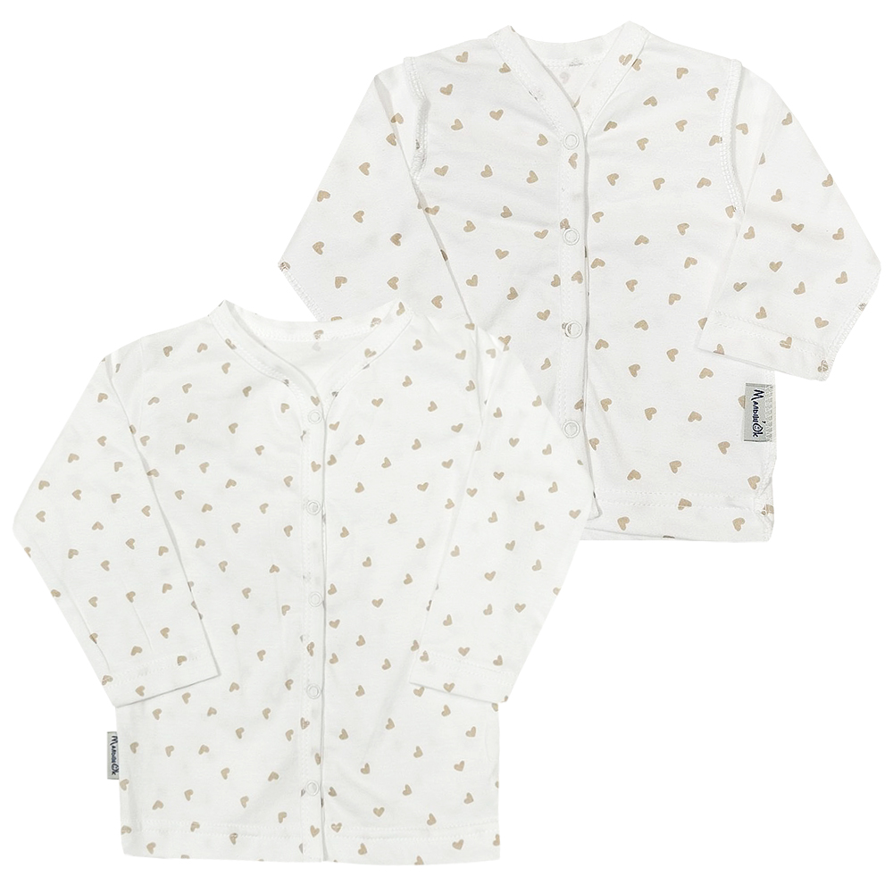 Кофточка прямого кроя для новорожденных малышек. Изготовлена из мягкого, приятного для кожи кулирного полотна с невероятно нежной петельчатой изнанкой (100% хлопок). Декорирована чувственным принтом "Сердечки". Горловина и планка обработаны трикотажным кантом из эластичного полотна в тон. Застёжка кофточки выполнена в виде удобных кнопок по центру, по всей длине. Длинный втачной рукав. Низ изделия и рукавов подвернут и прострочен двойной строчкой. Швы наружу. С лицевой стороны в боковом шве вшивной элемент. У размера 74 швы вовнутрь.