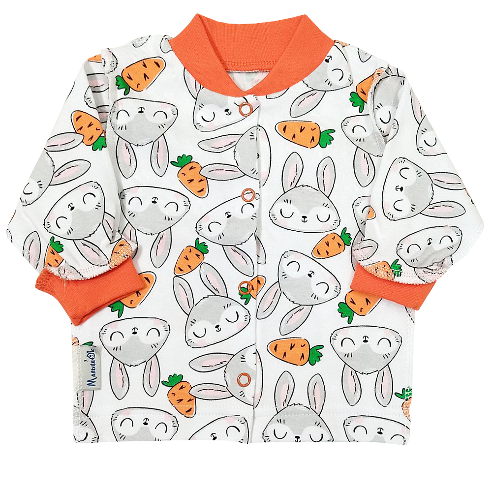 Кофточка прямого кроя для новорожденных малышек. Выполнен из мягкого и легкого трикотажного полотна – интерлок, с нанесением рисунка "Мордашки зайчат и морковки ". Горловина и низ рукавов с отделкой из трикотажа. Застёжка кофточки выполнена в виде удобных кнопок по центру, по всей длине. Длинный втачной рукав. Низ изделия обработан швом вподгибку двойной строчкой. С лицевой стороны в боковом шве вшивной элемент. Наружные швы. У размеров 74, 80 швы вовнутрь.