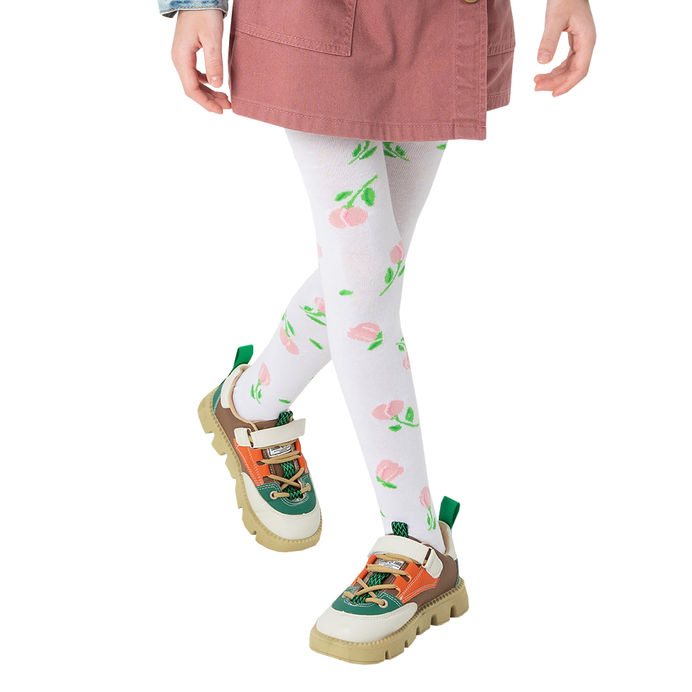 Хлопковые колготки для девочек. Украшены нежным принтом по всей длине изделия. В поясе на эластичной резинке. Модель с двумя швами сзади.