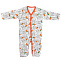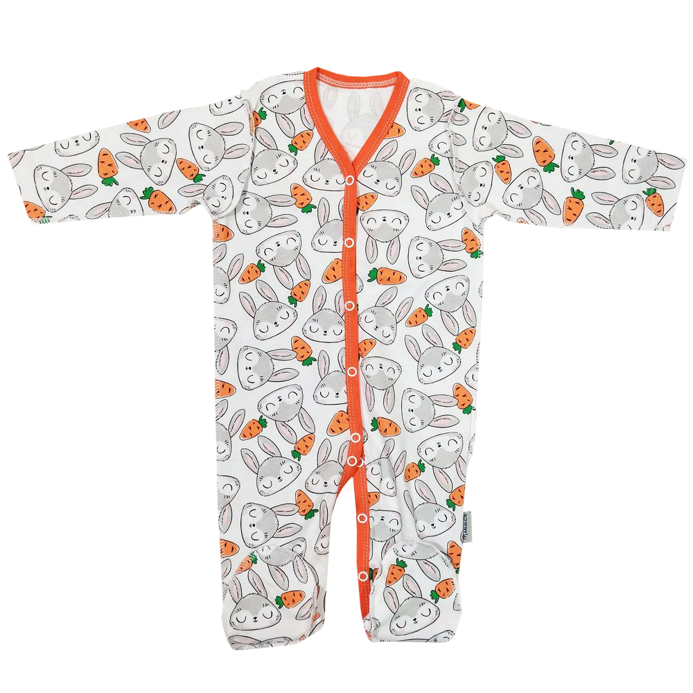 Комбинезон свободного кроя для новорожденных малышей. Выполнен из мягкого и легкого трикотажного полотна – интерлок, с нанесением рисунка «Зайки с морковками» (100% хлопок). Модель с закрытыми носочками, швами наружу до 68 размера включительно. Горловина, планка обработаны трикотажным кантом из эластичного полотна в сочно-морковном оттенке. Длинный-втачной рукав, низ рукавов подвернут и прострочен двойной строчкой. Застёжка комбинезона выполнена в виде удобных кнопок по центру, по всей длине туловища, и по штанишкам. Штанишки с ластовицей. С лицевой стороны в боковом шве вшивной элемент. У размера 56 рукав-реглан. У размеров 50, 56 низ рукавов закрыт варежками - антицарапками. У размера 74, 80 - швы вовнутрь.