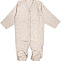 Комбинезон свободного кроя для новорожденных малышей. Выполнен из однотонного трикотажного полотна (интерлок). Модель с закрытыми носочками. Горловина, планка обработаны трикотажным кантом из основного полотна. Длинный втачной рукав, низ рукавов подвернут и прострочен двойной строчкой. Застёжка комбинезона выполнена в виде удобных кнопок по центру, по всей длине туловища, и по штанишкам. Штанишки с ластовицей. Наружные швы. С лицевой стороны в боковом шве вшивной элемент. В размере 56 рукав реглан с варежкой-антицарапкой.