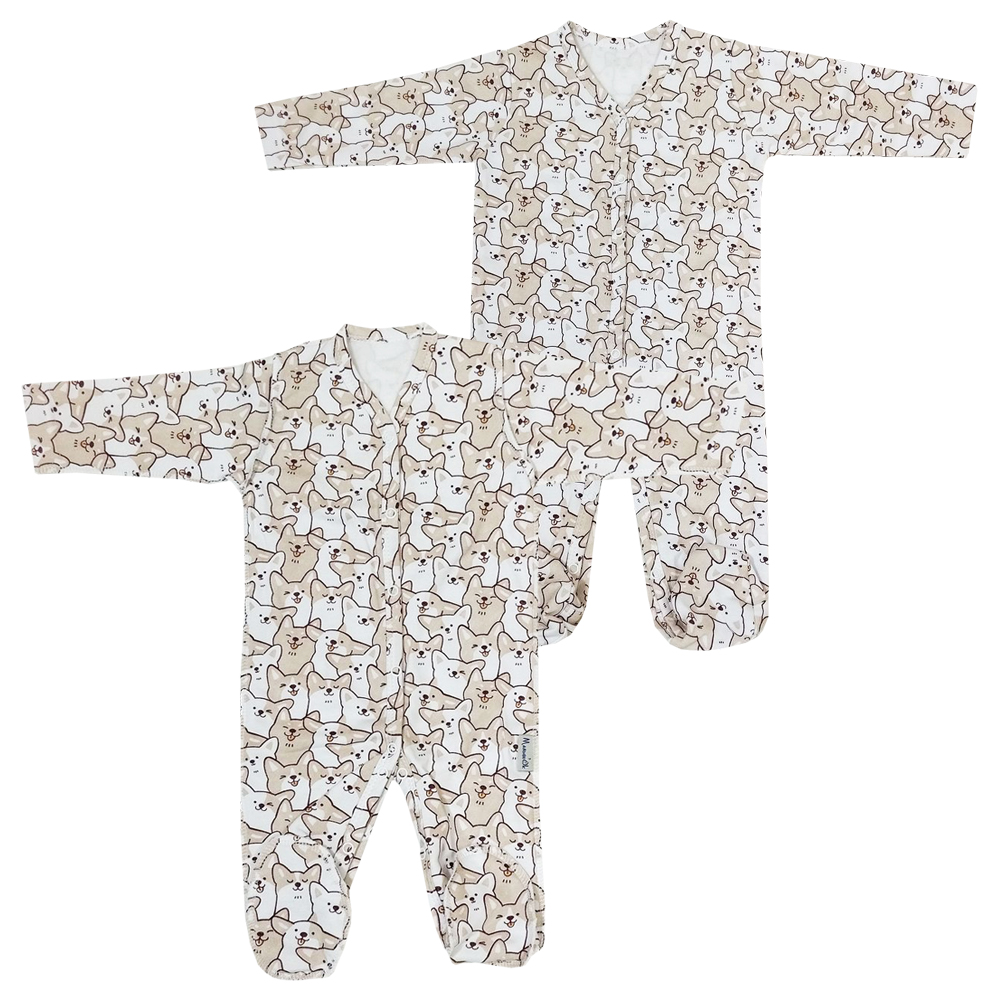 Утепленный комбинезон свободного кроя для новорожденных. Изготовлен из трикотажного полотна - футер, с мягкой изнанкой начесом, с нанесением рисунка "Корги" по всему изделию. Модель с закрытыми носочками, швами наружу. Горловина и планка обработаны трикотажным кантом. Рукава обработаны швом вподгибку двойной строчкой. Застёжка комбинезона выполнена в виде удобных кнопок по центру, по всей длине туловища, и по штанишкам. Штанишки с ластовицей. С лицевой стороны в боковом шве вшивной элемент. У размера 74 швы вовнутрь.