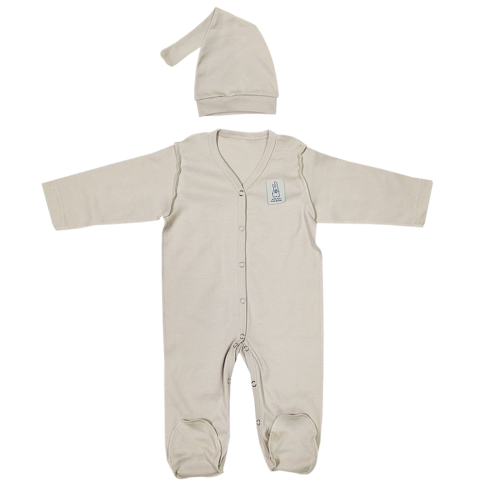 Комплект для новорожденных, состоящий из комбинезона и шапочки. Выполнен из однотонного х/б трикотажа (интерлок), нежный и приятный к телу 100% хлопок.