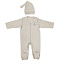 Комбинезон свободного кроя с закрытыми носочками. На груди нашивка с надписью на английском языке "С любовью из Байкала". Горловина и планка обработаны трикотажным кантом. Застёжка комбинезона выполнена в виде удобных кнопок по центру, по всей длине туловища, и по штанишкам. Длинный рукав-втачной, низ рукавов подвернут и прострочен двойной строчкой. Штанишки с ластовицей. Модель с закрытыми носочками. Наружные швы. У размера 56, 62 рукав-реглан заканчивается руковичкой.