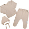 Комплект для новорожденных, состоящий из распашонки, ползунков и чепчика. Выполнен из х/б трикотажа (интерлок). Распашонка с запахом. Рукав с варежкой антицарапкой. Застежка кнопки снаружи с левой стороны, изнутри с правой стороны. Наружные швы.