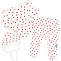 Комплект для новорожденных, состоящий из распашонки, ползунков и чепчика. Выполнен из фактурного х/б трикотажа (интерлок) с мелким принтом "Сердечки". Распашонка с запахом. Рукав с варежкой антицарапкой. Застежка кнопки снаружи с левой стороны, изнутри с правой стороны. Наружные швы.