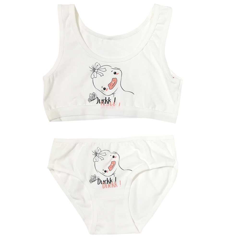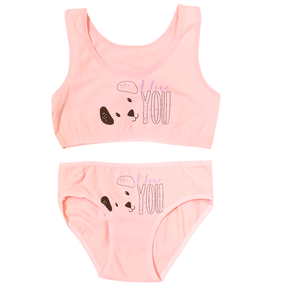 Комплект белья для девочек, состоящий из топа и трусиков. Выполнен из трикотажного полотна кулирка (95 % хлопок, 5% эластан). Комплект украшен веселым принтом с надписями.