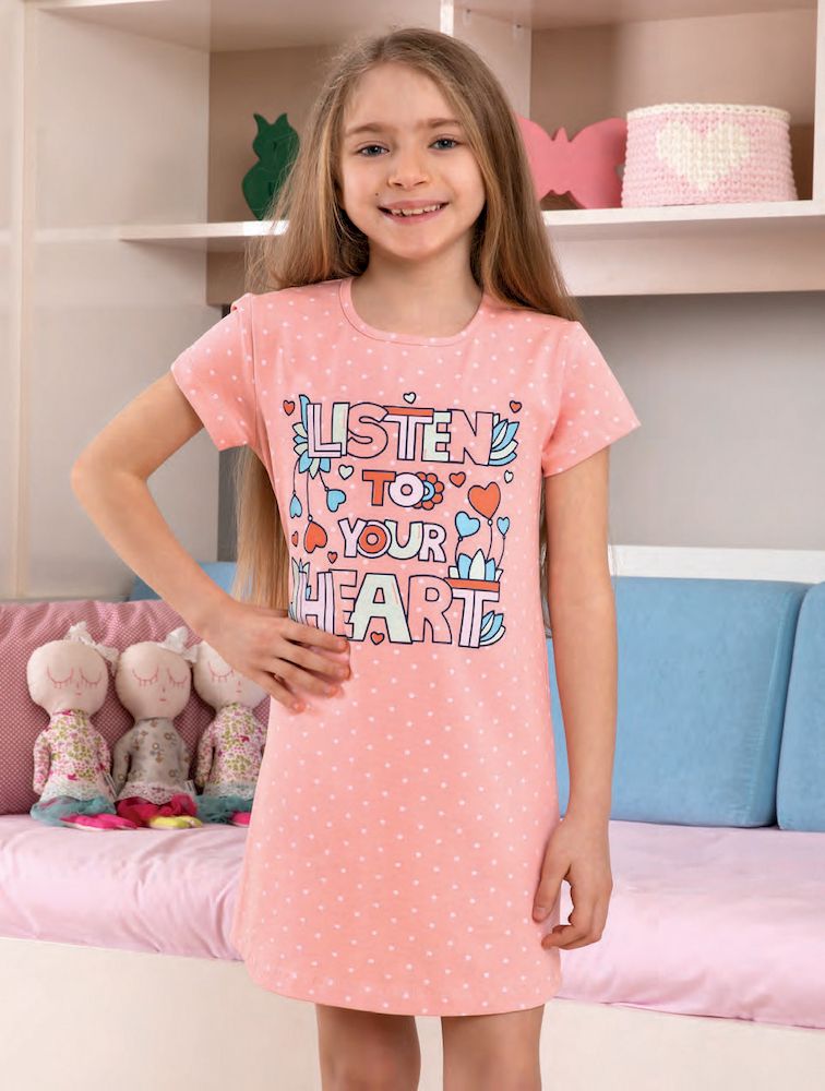 Туника для девочки, из эластичного х/б трикотажа в горошек. Расклешенный силуэт. Горловина отделана трикотажным кантом. На груди красочный принт из надписей.