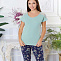 Футболка однотонная, с V-образным вырезом и кружевными вставками на плечах. Полуприлегающий силуэт. Заниженная пройма, спущенное плечо. Горловина на тонком манжете. Застежка на две пуговицы, обтянутые трикотажем с рисунком.