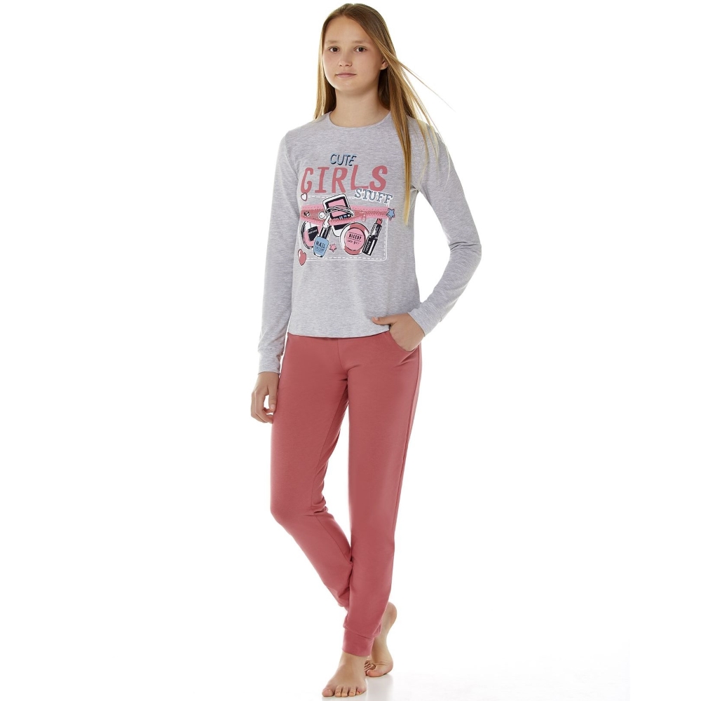 Пижама для девочек подростков, может использоваться как домашний костюм. Джемпер из трикотажа (кулирное полотно) украшенный термопринтом "косметичка", Прямой силуэт. Горловина обработана трикотажным кантом. Рукава на манжете.