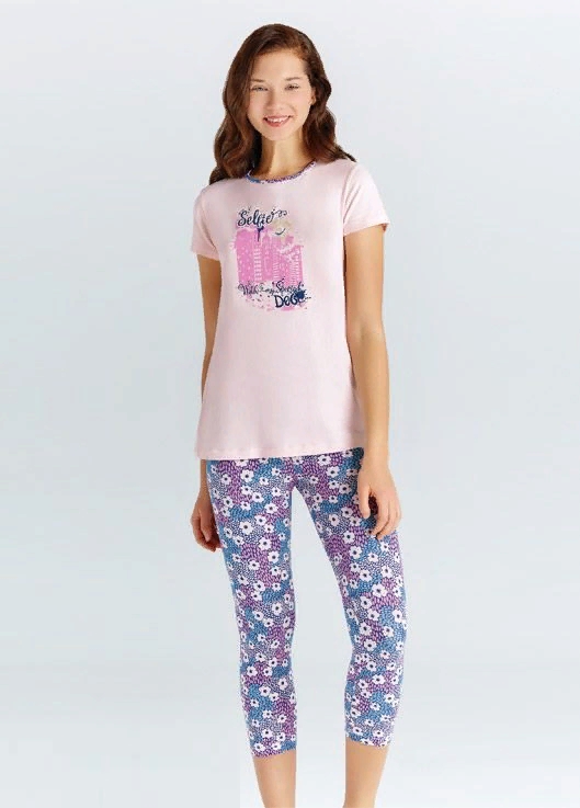 Лосины укороченные, из трикотажа с цветочными рисунками, на закрытой резинке в поясе. По бокам лампасы из однотонного трикотажа.