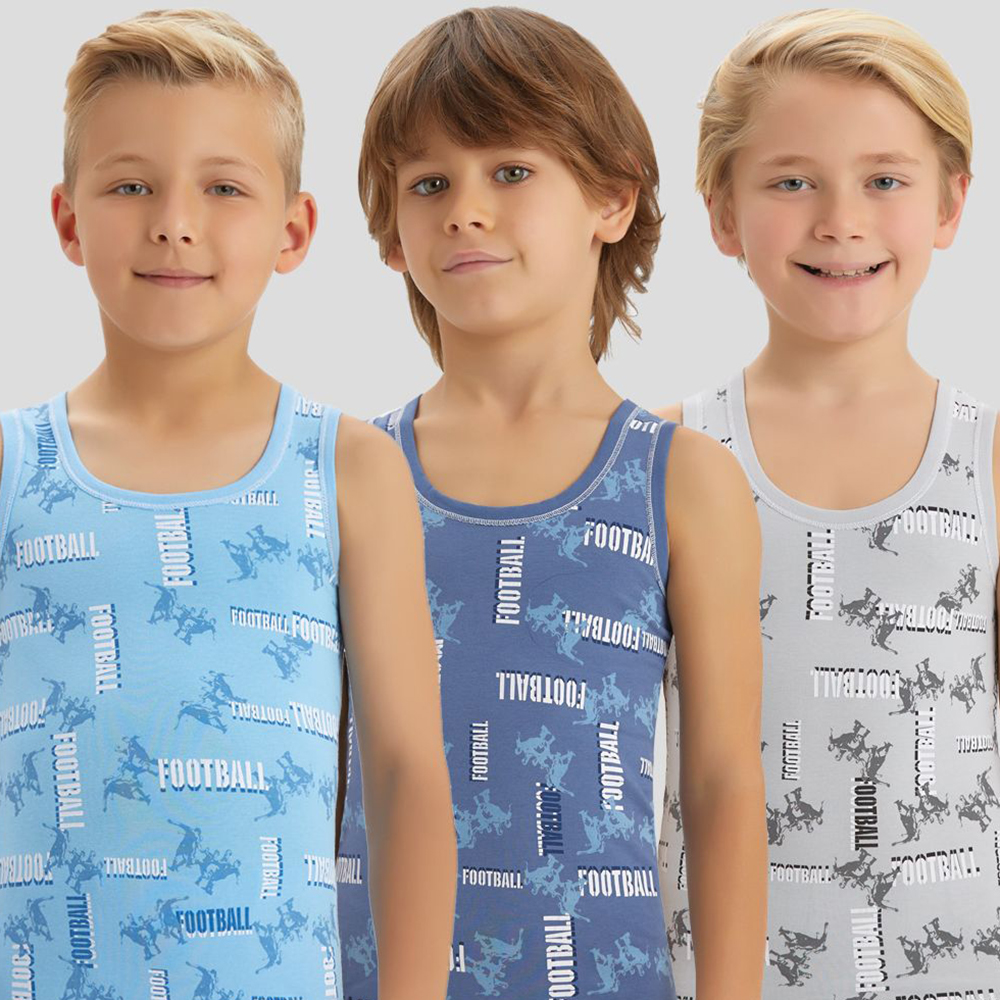 Майка для мальчика из эластичного х/б трикотажа, с рисунками "футбол". Горловина и проймы отделаны трикотажным кантом.