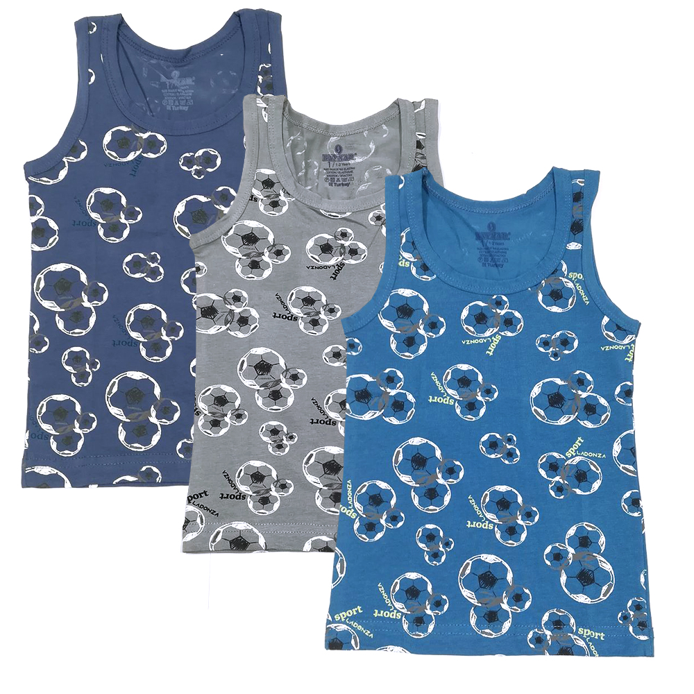 Майка для мальчика, из эластичного х/б трикотажа, с принтом "футбол". Горловина и проймы отделаны трикотажным кантом.