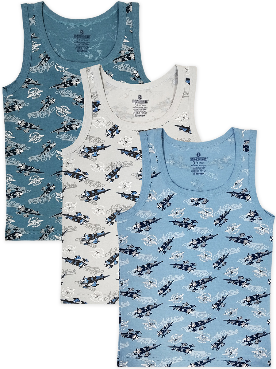 Майка для мальчика, из эластичного х/б трикотажа, с красочными рисунками "воздушный патруль". Отделана трикотажным кантом.