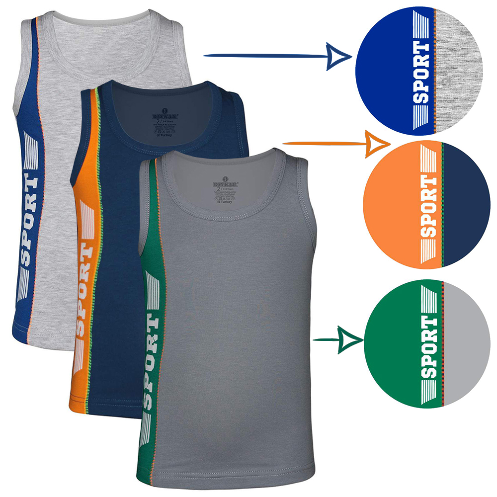 Майка для мальчика, в количестве 3 штук, одного размера, в трех расцветках. Майка из эластичного, х/б трикотажа кулирное полотно. Вертикальный рельеф с отделкой ярким, тонким кантом и надписью "спорт". Горловина и проймы отделаны эластичным, трикотажным кантом.