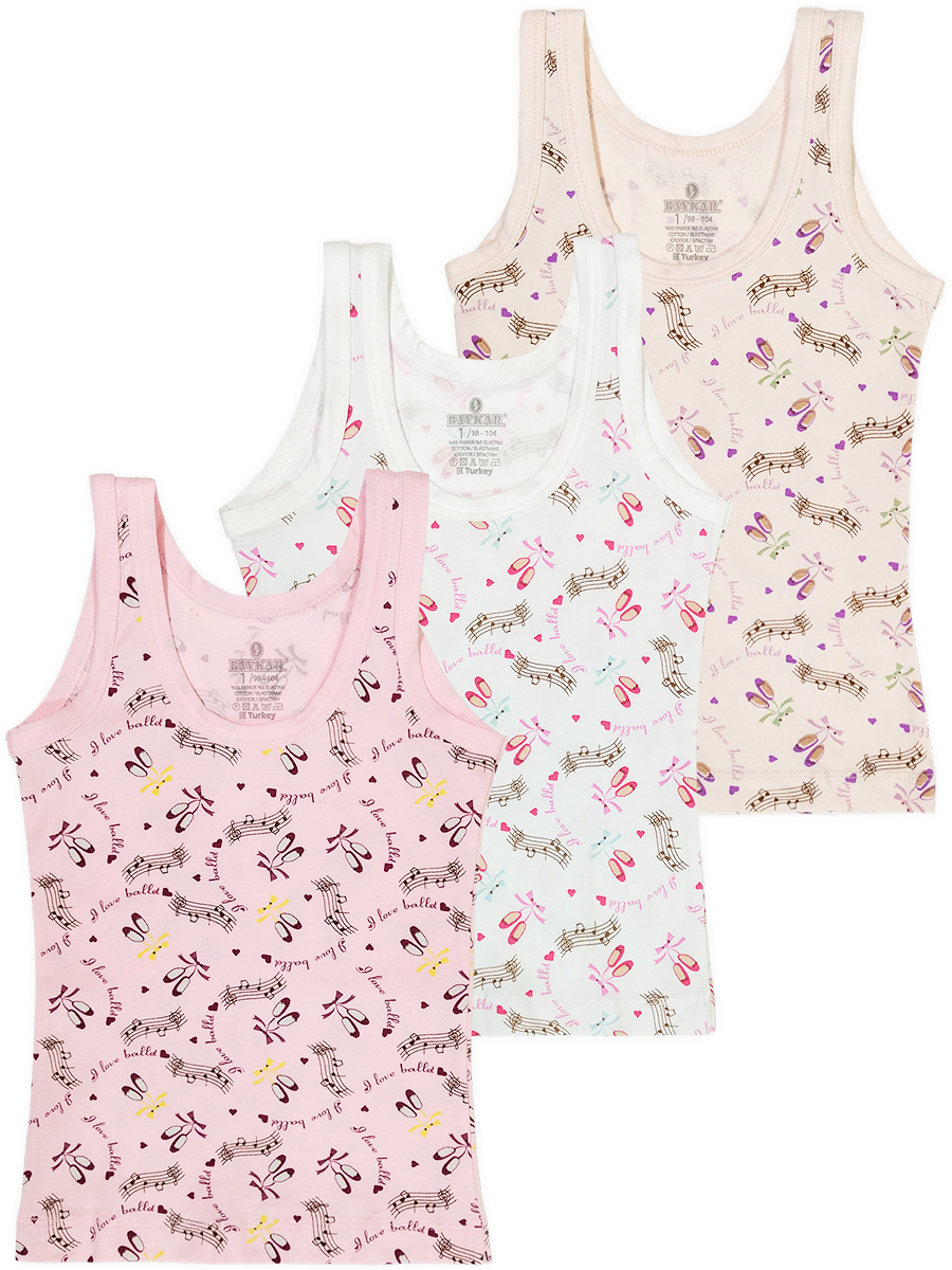 Маечка для девочки из эластичного х/б трикотажа с рисунками "балет". Полуприлегающий силуэт. Широкие бретели. Вырез, бретели, проймы отделаны трикотажным кантом.