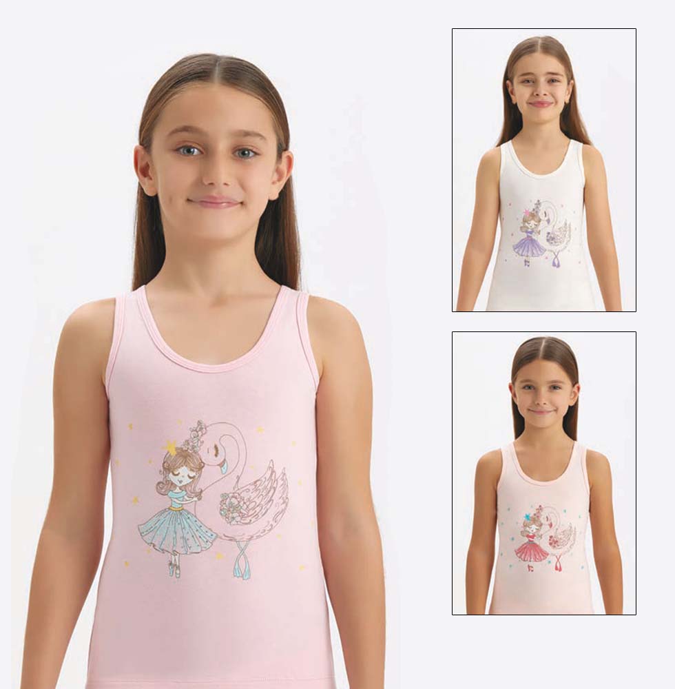 Маечка для девочки, из эластичного х/б трикотажа с принтом "принцесса и лебедь", украшенный стразами. Полуприлегающий силуэт. Широкие бретели отделаны эластичным трикотажным кантом.