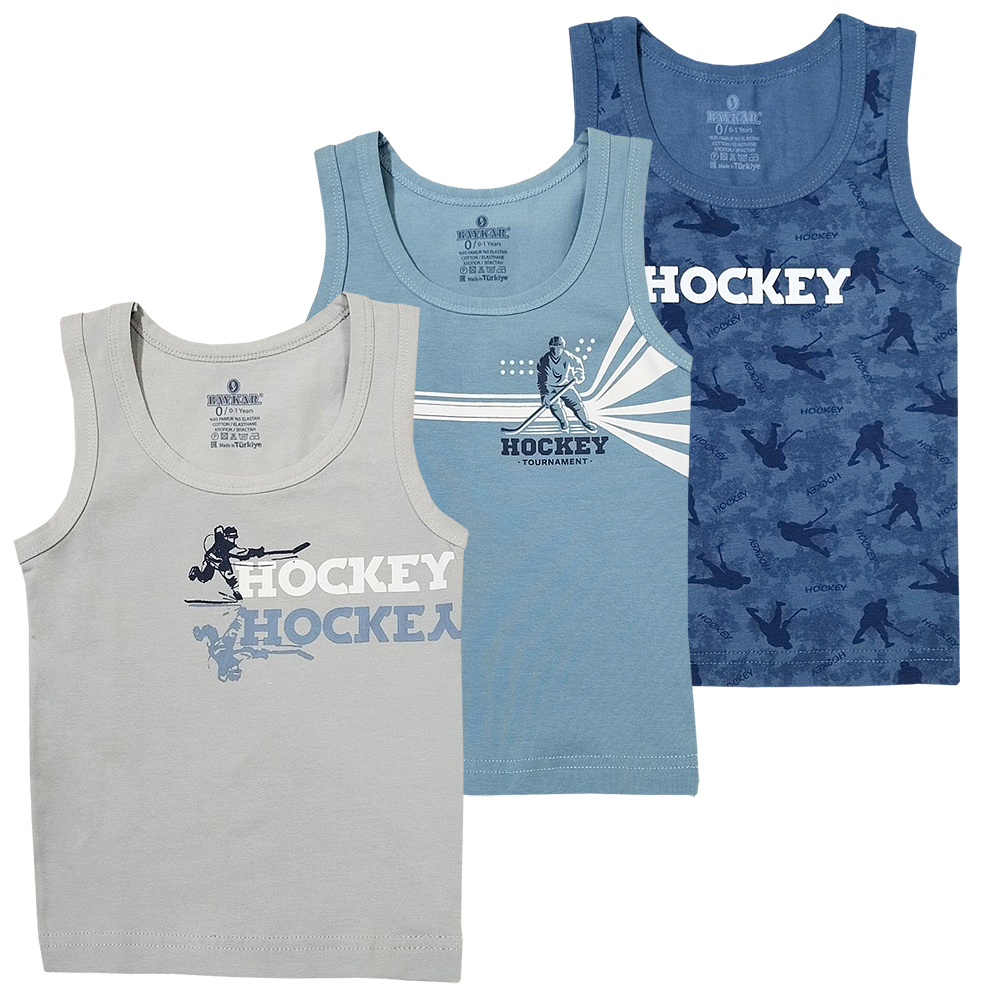 Майка для мальчика на широких бретелях. Модель приталенного покроя, выполнена из эластичного х/б трикотажа кулирное полотно. Декорирована принтом "Хоккей". Горловина и проймы отделаны эластичным, трикотажным кантом. Низ изделия обработан швом вподгибку двойной строчкой.