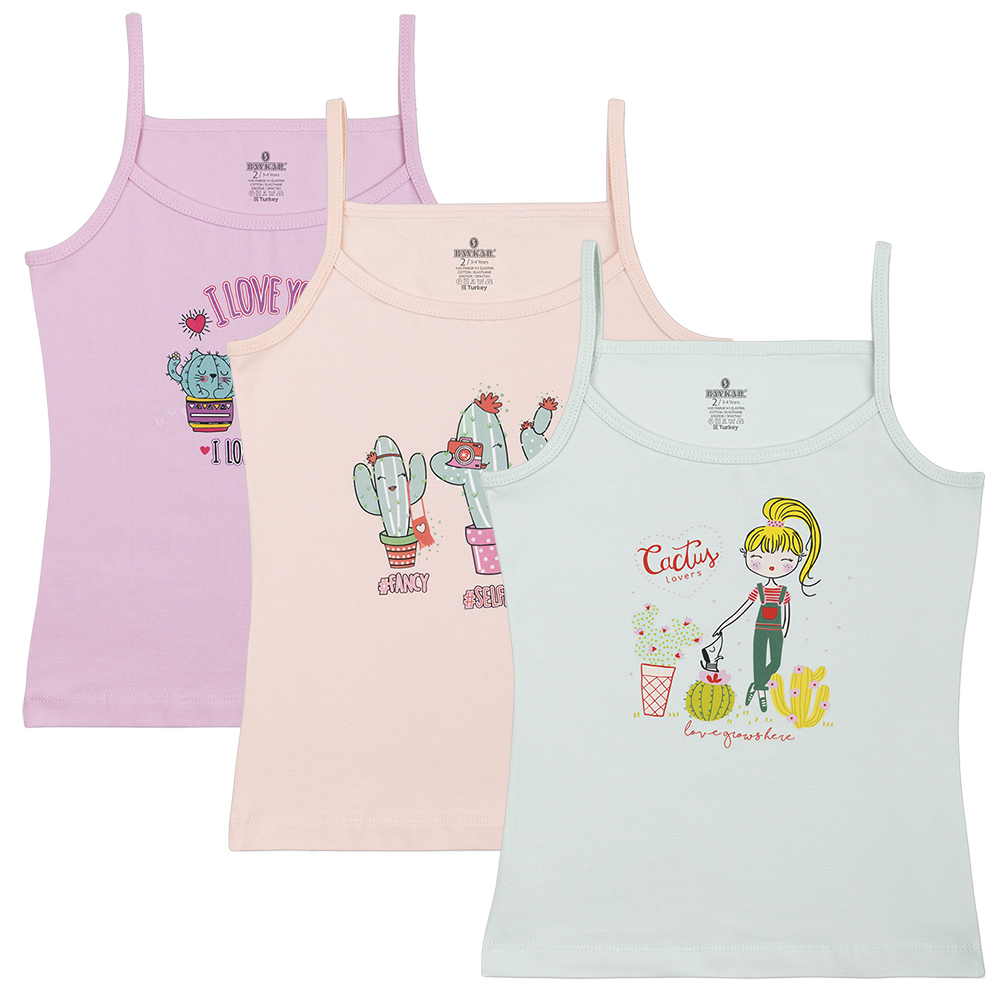 Майка для девочки на тонких бретелях. Модель приталенного покроя. Выполнена из эластичного х/б трикотажа кулирное полотно. Передняя половинка декорирована ярким принтом "Любимые кактусы". Отделка выреза и пройм из эластичного трикотажного канта в тон полотна. Низ изделия обработан швом вподгибку двойной строчкой.