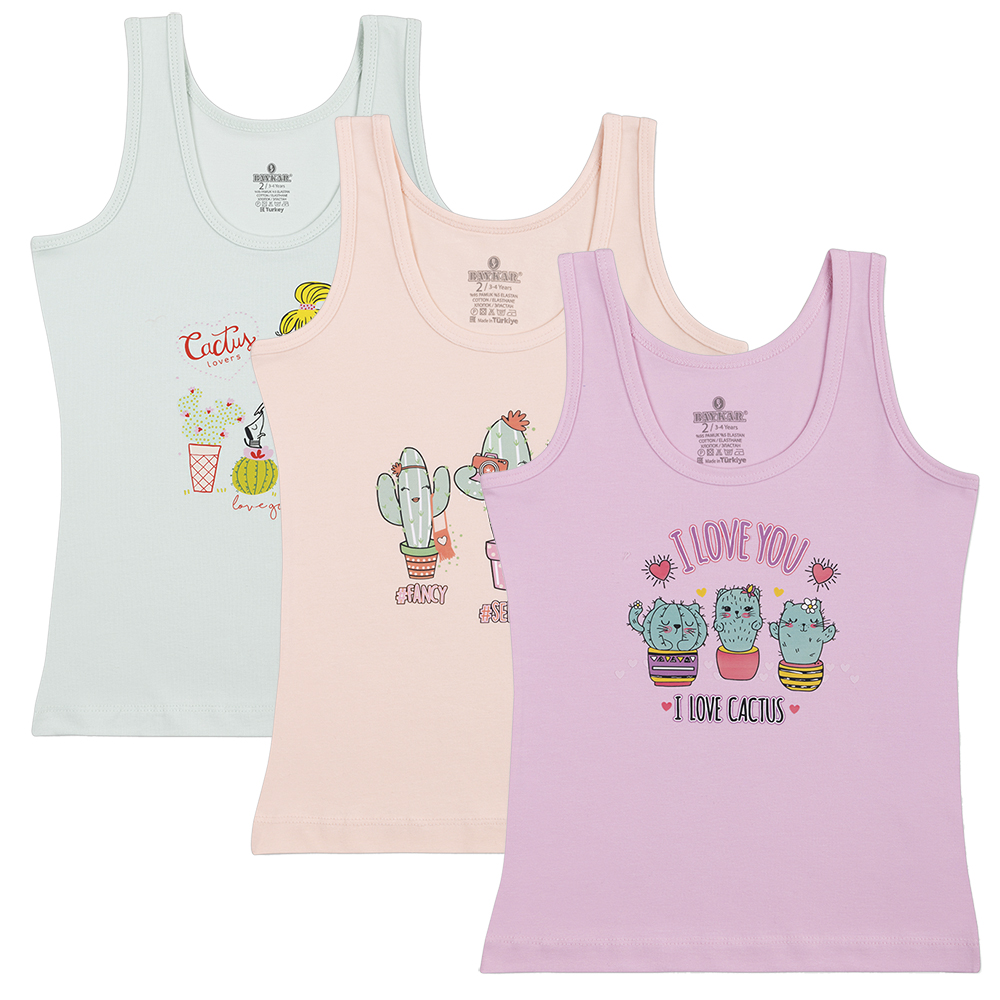 Майка для девочки на широких бретелях. Модель приталенного покроя. Выполнена из эластичного х/б трикотажа кулирное полотно. Передняя половинка декорирована ярким принтом "Любимые кактусы". Отделка выреза и пройм из эластичного трикотажного канта в тон полотна. Низ изделия обработан швом вподгибку двойной строчкой.