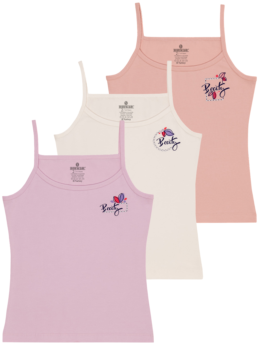 Майка для девочки на тонких бретелях. Модель приталенного кроя. Выполнена из эластичного х/б трикотажа кулирное полотно. Передняя половинка декорирована нежным принтом "Красота". Отделка выреза и пройм из эластичного трикотажного канта в тон полотна. Низ изделия подвернут и прошит двойной строчкой.