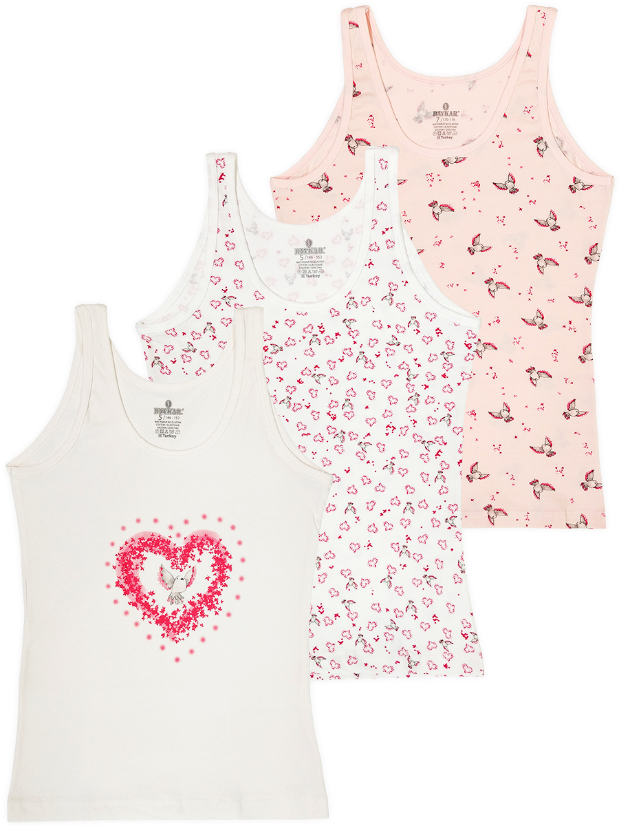 Маечка для девочки, из эластичного х/б трикотажа с принтом "птица любви". Полуприлегающий силуэт. Широкие бретели отделаны эластичным трикотажным кантом.