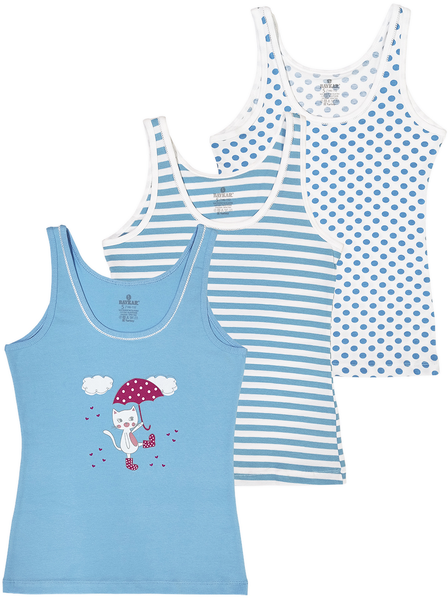 Маечка для девочки, из эластичного х/б трикотажа с различными принтами: из трикотажа в горошек/ из трикотажа в полоску/ из однотонного трикотажа с принтом "кошечка с зонтиком". Полуприлегающий силуэт. Широкие бретели отделаны эластичным трикотажным кантом.