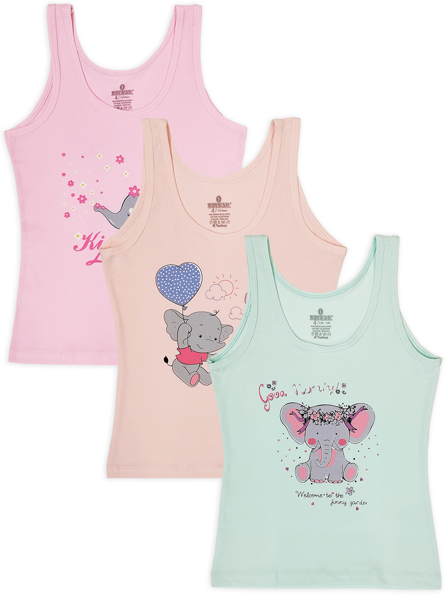 Майка для девочки, из эластичного х/б трикотажа, с красочным принтом "счастливый слоник". Полуприталенный силуэт. Широкие бретели отделаны эластичным трикотажным кантом.
