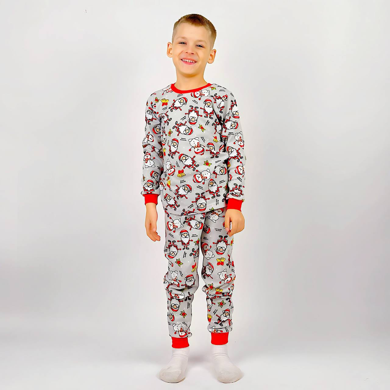 Пижама детская, состоящая из джемпера и брюк. Выполнена из х/б трикотажа (интерлок). Модель украшена новогодним принтом "Дедушка Мороз со своим маленьким помощником" по всей длине изделия.