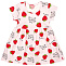 Платье из 100% нежного и воздушного хлопка — интерлок. Украшено ярким принтом "Клубника". Линия горловины круглая, отделана бейкой из основного полотна. Рукав короткий втачной. Нижняя часть платья расклешенного силуэта с небольшой сборкой. Низ юбки и рукавов с подгибом, обработан двойной строчкой. У размеров 86 и 92 на плечике застежка на 2 пробивные кнопки.