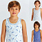 Майка для мальчика из эластичного х/б трикотажа с рисунками "динозавры". Горловина и проймы отделаны трикотажным кантом и декоративным швом.