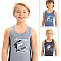 Майка для мальчика из эластичного х/б трикотажа, с принтом "акула". Горловина и проймы отделаны трикотажным кантом. По бокам фигурные вставки из трикотажа другого цвета.