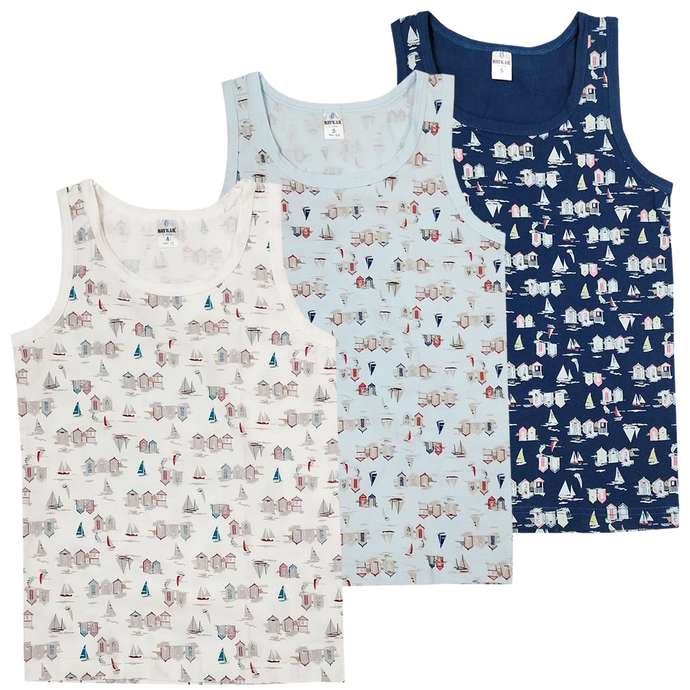Майка из трикотажа с принтом. Горловина и пройма отделаны эластичным кантом.