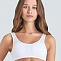 Топ белого цвета, с чашечками из поролона, на широких лямках, отделанных кантом. Спереди двуслойный, с отверстиями для вставки/выемки чашек. Под грудью на эластичной резинке. По центру присобран на резинке.