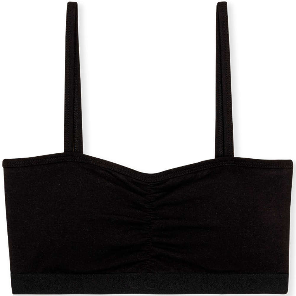 Детский бельевой топ с вынимающимися чашечками. Выполнен из мягкого и дышащего х/б трикотажа (кулирное полотно). Топ представлен в базовом черном цвете. Бретели, вырез и проймы отделаны эластичным кантом в цвет изделия. Под грудью на мягкой широкой резинке с надписью на английском языке. Спереди, по центру, сборка на резиночке.