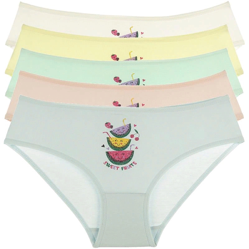 Трусы для девочки, из эластичного х/б трикотажа, с красочным принтом "сладкие фрукты", украшенным блестящей краской. В поясе и проймах отделаны эластичным трикотажным кантом.