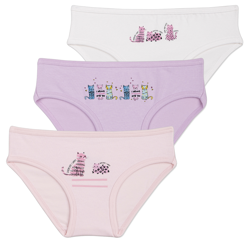 Трусы-слипы для девочки. Выполнены из эластичного х/б трикотажа кулирное полотно. Передняя половинка декорирована принтом "породистые кошечки". В поясе и проймах отделаны эластичным трикотажным кантом. Хлопковая ластовица.