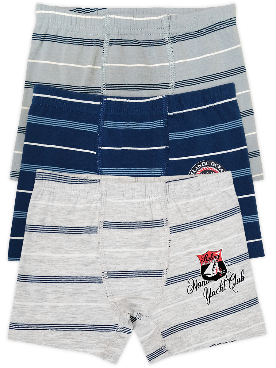 Трусы-боксеры для мальчика, из эластичного х/б трикотажа в тонкую полоску, с принтом-эмблемой в морском стиле. В поясе на закрытой резинке.