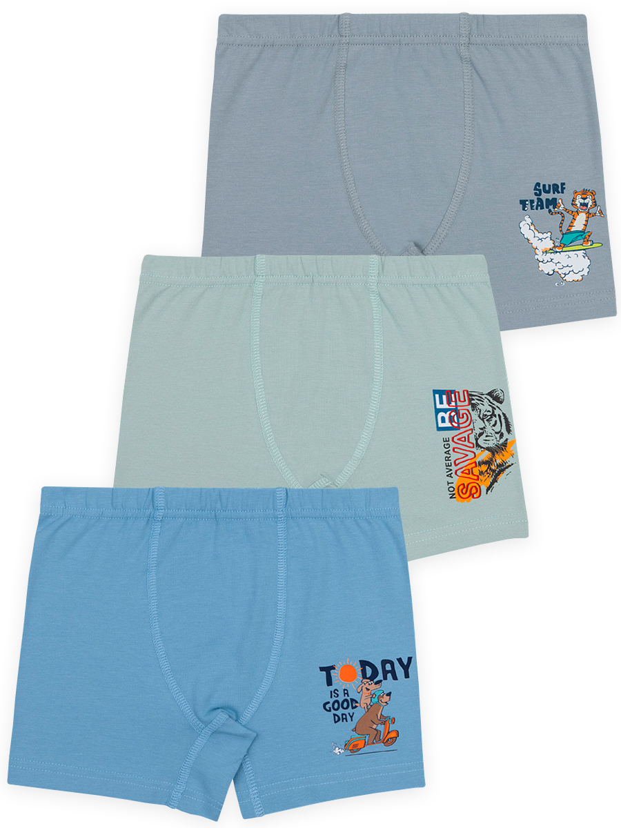Комплект боксеров для мальчиков. Боксеры выполнены из эластичного х/б трикотажа (кулирное полотно). Слева на передней половинке расположен принт "Животные" и надпись на английском языке (рус. "Надежная команда"). В поясе на закрытой резинке. В проймах подогнуты и прошиты двойной строчкой. Комфортные плоские швы.