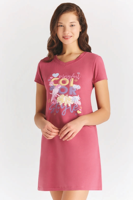 Туника для девочки, из эластичного х/б трикотажа, с красочным принтом на груди. Расклешенный силуэт. V-образный вырез, спереди на трикотажном манжете, на спинке с подворотом.